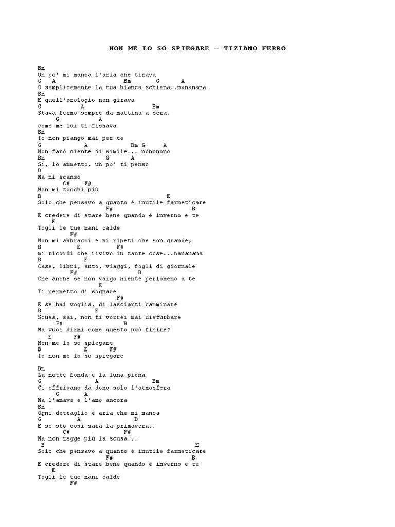 G a come me lui ti fissava bm io non piango mai per te g a bm g a non far niente di simile. Traduzioni delle canzoni, accordi per chitarra, spartiti musicali,bpm e molto altro. Ti penso d bm ma mi scanso e9 scusa, sai, non ti vorrei mai disturbare. Accordi chitarra spartiti tab e testo della canzone non me lo so spiegare di tiziano ferro 1000note. 6 years ago 6 years ago.